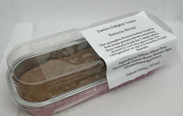 A naturally sweet, tail-wagging favorite! This soft-baked loaf is made with ripe bananas, unsweetened applesauce, whole wheat flour, and our signature homemade peanut butter — a wholesome treat your pup will love.